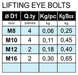 Lifting eye bolts and lifting eye nuts are placed in strong corrugated cardboard boxes with no dangerous metallic staples, with a product identification label (MINICERT) and in accordance with the quantities stated below. Each pack contains the mandatory instructions for use and the 3.1 EN 10204 certificate relative to each production lot.
