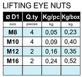 Lifting eye bolts and lifting eye nuts are placed in strong corrugated cardboard boxes with no dangerous metallic staples, with a product identification label (MINICERT) and in accordance with the quantities stated below. Each pack contains the mandatory instructions for use and the 3.1 EN 10204 certificate relative to each production lot.